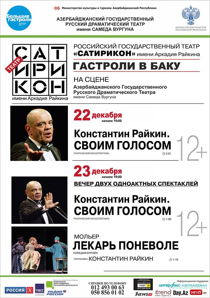 Ilk dəfə Bkıda dekabrın22 və23-ü Rus dram teatrının səhnəsində Arkadiy Raykin adına olan Satirikon adlı Rusiya milli teatrının qastrol tamaşaları keçiriləcək.