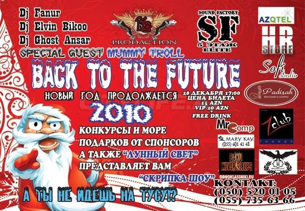 28 dekabr saat 17:00-da Sound Factory klubunda "Back to the Future" adlı əyləncə gecəsi keçiriləcəkdir. Bütün gecə boyu sizlərlə - DJ Fanur, DJ Elvin Bikoo, DJ Ghost Anga.Giriş - 15 AZN, VIP+ free drink -20 AZN. Əlaqə telefonlar - (+994 50) 520 01 05, (+994 55) 735 63 66.