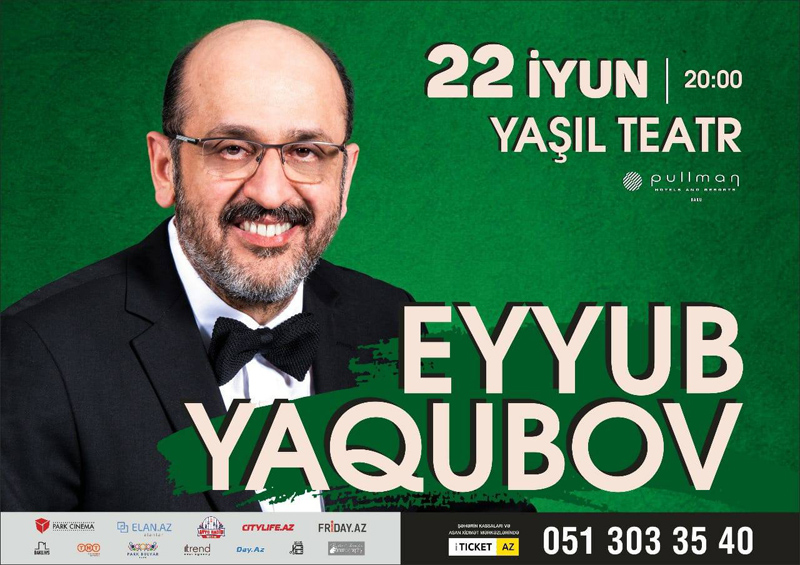 22 İyun 20:00-da, Yaşıl teatrın səhnəsində, Eyyub Yaqubovun konserti keçiriləcək. Biletləri şəhərin kassalarında və Asan xidmətdə yerləşən kassalarda əldə edə bilərsiz. Konsertdə bu günə kimi repertuarında yer alan ən sevilən mahnılarını ifa etməklə yanaşı, yeni bəstələri də dinləyicilərə təqdim edəcək.