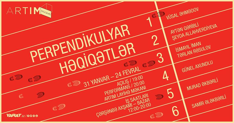 YARAT Müasir İncəsənət Məkanı ARTIM ROOMS layihəsi çərçivəsində "Perpendikulyar həqiqətlər" adlı sərgini təqdim edir. ARTIM ROOMS layihəsinin üçüncü sərgisi rəssamlar Samir Ələkbərli, Vüsal Əhmədov, Aytən Qəribli və Şeyda Allahverdiyeva dueti, Murad Əkbərli, Günel Axundlu və dramaturq İsmayıl İmanın (teatr rejissoru Tərlan Rəsulovla birgə) müstəqil layihələrini təqdim edir. Layihənin növbəti buraxılışında rəssamlar kvant fizikası qanunlarının təsiri, insanın daxili gücü və çətinlikləri haqda fərziyyələr, adət-ənənələrin interpretasiyası və region həyatının refleksiyası haqqında mövzulara fərqli baxış təklif edirlər.