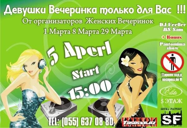 Əziz Xanımlar! Əgər siz birlikdə günivizi şən kecirmək istəyirsizsə, onda hamınızı "Lady`s Party" 4 gecəsinə dəvət dirik! Həmcinin sizləri şou parodiya tanınmış mügənnilərə gözləyir! Oğlanlara qiriş qəti qadagandır!