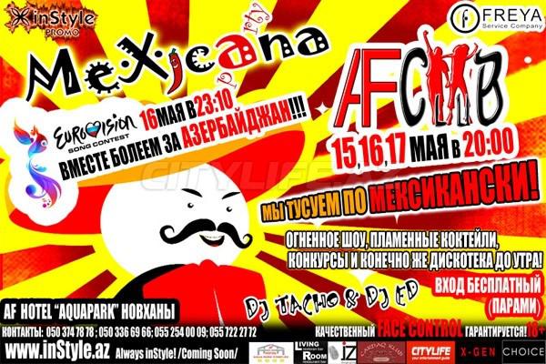 Meksikanca əylənirik! Sizləri ləzzətli kokteylər, fantastik şou-program, məzəli yarışlar və viktorinalar, və nəhayət səhərədək diskoteka sizləri Af Clubda gözləyir. Üç unudulmaz gecəni Novxanıdakı Af Clubda bizimlə keçir, və 16 may bizimlə birgə Eurovision 2009 müsabiqəsini izlə. Giriş yalnız cütlüklər üçün pulsuzdur. Keyfiyyətli Face control.