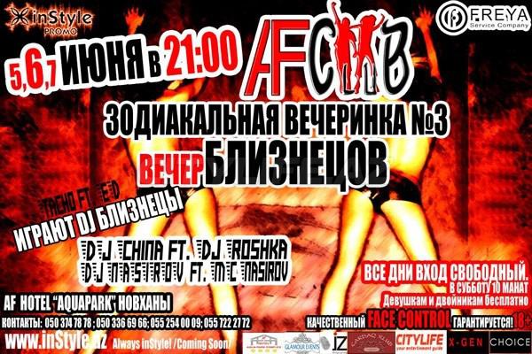 AF Club təqdim edir! Üç gecə unudulmaz Bürclər əyləncə gecələri baş tutacaqdırlar. Bu dəfə bu Əkizlər bürcünə həsr olunmuş gecələr olacaqdırlar! Sizləri bu misilsiz, üç gecə davam edən, DJ China FT. DJ Roshka, J Nasirov FT. MC Nasirov`dan ən son hitli musiqili gecələrə dəvət edirik! Bütün günlər giriş azaddır, yalnız şənbə günü - 10 AZN. Xanımlar üçün giriş azaddır! Face control keçirilir!