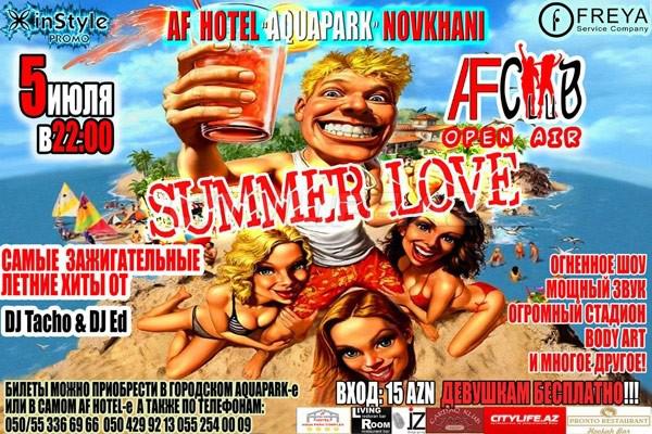 Yayın ən qızmar hitləri DJ Tacho& DJ Ed`in ifalarında! Alovlu şou-program, güclü səs, böyük stadion, Body art və daha nələr sizləri misilsiz və unudulmaz Open Air əyləncə gecəsində baş tutacaqdır! Unutmayın yalnız Summer Love party Af Club`da!