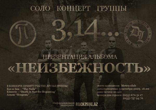 3 oktyabr "Metro" klubda "3.14" grupun səbirsizliklə gözlədiyimiz "Zərurilik" albomunun təqdimat mərasimi keçiriləcəkdir. Konsertdə alboma daxil olan xitlərdən başqa grupun ən sevimli mahnıları da səslənəcəkdir. Mərasimdə albomun çıxışında fəaliyyət görən şəxlər və digər grup təmsilçiləri də iştirak edəcəklər. Bütün konsertə gələn şəxslərə yeni albom hədiyyə veriləcəkdir.