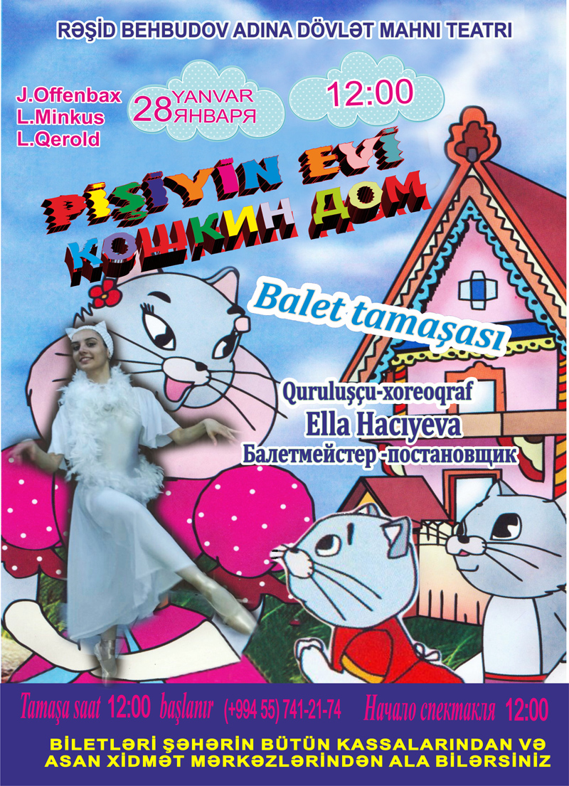 Uşaqlar üçün yumor elementləri ilə klassik balet Mahnı teatrında “Pişiyin evi” adlı tamaşada sizə təqdim olunacaq. Biz sizin uşaqları balet klassikası ilə tanış edəcəyik. Baletmeyster və quruluşçu rejisser – Ella Hacıyeva.