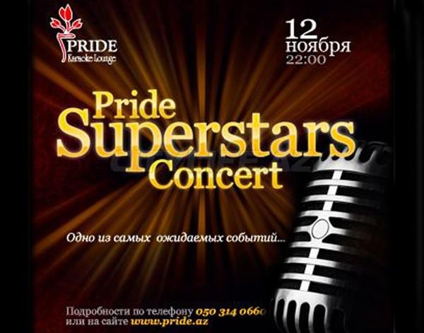 12 noyabr karaoke pərəstişkarların və Pride Karaoke Lounge qonaqlarının çoxdan səbirsizliklə gözlədiyi vaxt gəlib çatır! Yalnız bu gün sizin Pride Superstars Concert`ində iştirak etmək və Pride Superstar olmağa şansınız olacaqdır! Müsabiqənin qaydalarıilə www.pride.az saytında yaxın tanış ola bilərsiniz! İştirak etmək üçün sifarişi əldə etmək üçün bu nömrəyə zəng edə - (+994 50) 314 06 60, və ya Pride kluba hər gün saat 19:00-dan 05:00-dək gələ bilərsiniz. Sifarişlər 11 noyabradək qəbul olunulur. Tələsin sifarişlərin sayı məhduddur!