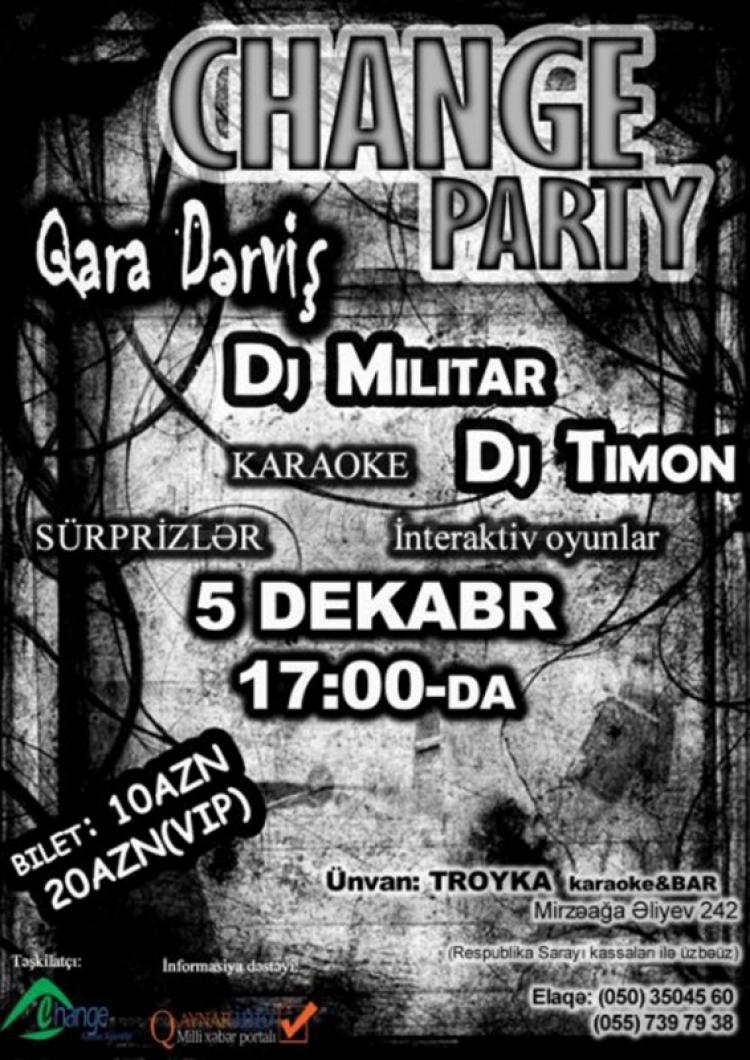 "Troyka Club" misilsiz "Change Party" əyləncə gecəsini təqdim edir! Sizləri interraktiv oyun və saysız hədiyyələr gözləyir! DJ Militar və DJ Timon`nan ən son və ən hit musiqi! Əlavə məlumat üçün əlaqə nömrələr: (+994 50) 350 45 60, (+994 55) 733 79 38. Biletlər: 10 AZN, VIP -20 AZN.