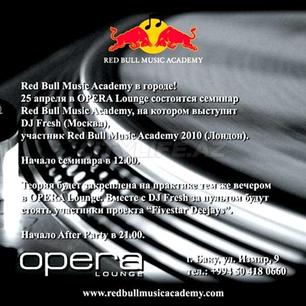 Red Bull Music Academy in Baku! On April, 25th in Opera Lounge seminar Red Bull Music Academy with the participation of DJ Fresh - participant of Red Bull Music Academy 2010 (London) will take place. The seminar begins in 12:00. The theory will be fixed in practice in the same evening in Opera Lounge. Together with DJ Fresh will act participants of the project "Fivestar Deejays". After party begins at 21:00.