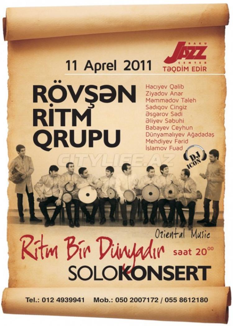 The first solo concert of group "Rovshan Ritm" will take place on the scene of Baku Jazz Center on April, 11th. Musicians of ensemble: Galib Gadzhiev, Anar Zijadov, Taleh Mamedov, Chingiz Sadyhov, Sedi Askerov, Sabuhi Aliev, Dzheyhun Babayev, Agadadash Dunyamaliev, Farid Mehtiev, Fuad Ismaylov. We wait for all admirers of national music!