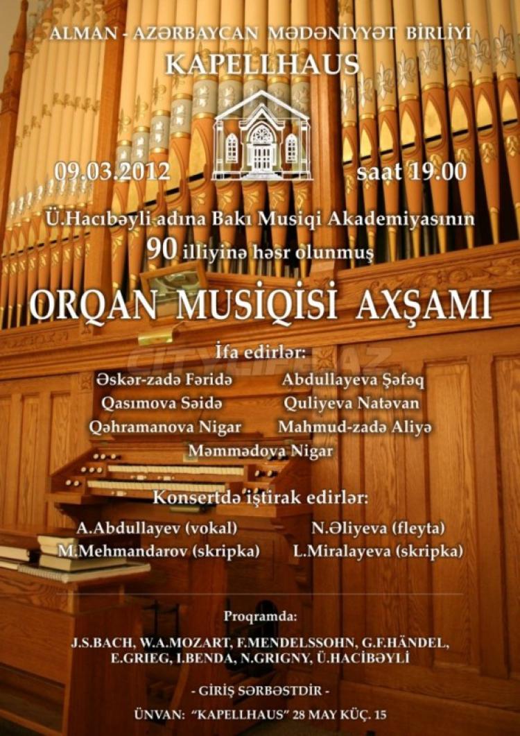 On the stage of Kapelhaus will take place concert of organ music devoted to the 90 anniversary of Baku Musical academy. In the program will be performed compositions of I.S.Bach, V.A.Mozart, F.Mendelson, Handel, Grieg, U.Gadzhibekov. In the concert will take part: Abdullaeva Shafag, Gulieva Natavan, Mahmud-zadeh Aliya, Kagramanova Nigyar and other musicians.