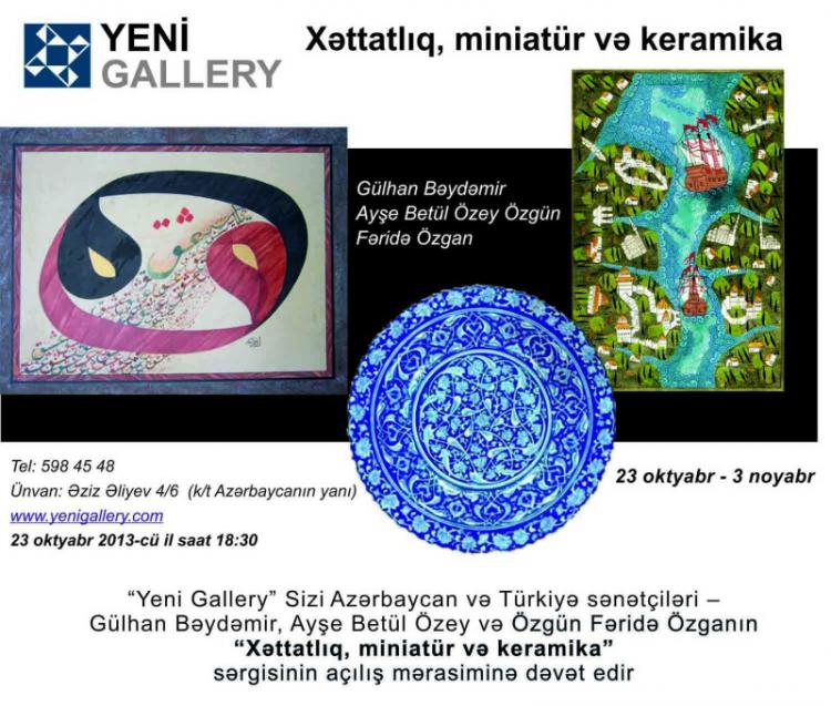 On October, 23 at 18:30 "Yeni Gallery" will take place opening ceremony of exhibition of the Azerbaijan and Turkish artists Gyulkhan Beydemir, Aisha Betul Ozey and Okhgyun Ferida Ozgan under the name "Calligraphy, Miniatures and Ceramics".