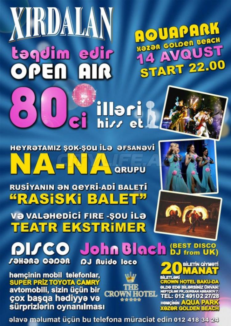 The concert group "Na-Na" will take place in Baku in Aqua Park Khazar Golden Beach in the limits of Open Air Party! The most non-ordinary Russian show ballet, delightful fiery show, drawing of mobile phones, super-prize Toyota Camry and many other prizes and gifts! Disko with DJ John Blanch! A disco till the morning from DJ Ruido Loco!