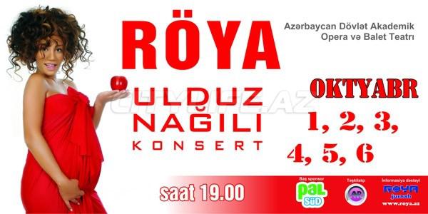 Dramatized show of singer Roya will take place from October, 1 till October, 6th in Theatre an opera and ballet. All fans and admirers of creativity of the superstar will be surprised by new hits, unpredictable duets! 15 concert suits for forthcoming show prepares the fashion designer of Sabine Guseyn, who was the author of suits of Roji for its first solo concert «Bu gece».