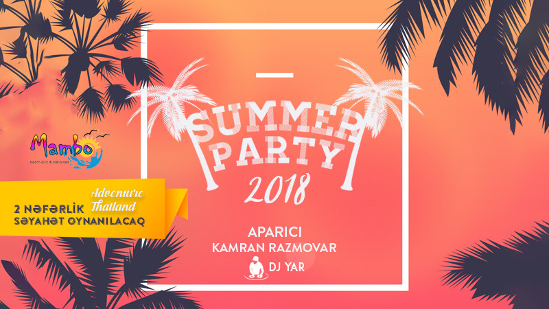 Мы рады пригласить вас, друзья, на шоу программу "Summer party 2018" в Mambo Beach! Этот вечер будет особенным для вас, потому что и мы и наши гости приложат все усилия, чтобы атмосфера вечера была дружеской и зажигающей! Ведущий программы - Кямран Размовар. Весь вечер вас будут сопровождать DJ Russel. Вас ждут зажигательные хиты от всеми любимого певца Рауфа. А также знаменитоe Light show. Всех наших гостей ждут сюрпризы и конкурсы. Главный розыгрыш вечера - путёвка на двоих в Тайланд!