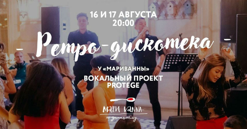 С радостью приглашаем всех жителей и гостей солнечного Баку на одну из самых веселых, душевных вечеринок нашего города — ретро-дискотеку в ресторане «МариVanna»! Настоящая дача, расположившаяся прямо в центре города, с лучшими блюдами советской кухни и соответствующей атмосферой, уже готовится к двухдневному празднику. Вместе вспомним известные ретро-хиты 80-90х — будем танцевать и подпевать песням «Руки Вверх», «Иванушек», «Ласкового Мая», Аллы Пугачевой и других любимых артистов. Исполнять их для вас также будет московский дуэт «PROTEGE», состоящий из двух талантливых вокалистов — участник телепроектов «Голос» и «Новой звезды» Роман Исаев и финалист шоу «Большая перемена» Евгений Горелов. Ждем всех!