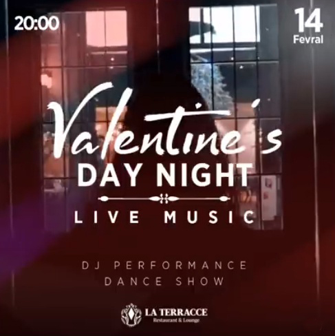 La Terracce предлагает вам идеальную возможность встретить 14 февраля с Вашим любимым человеком. 14 февраля в 20:00, приглашаем Вас в La Terracce, на чудесный вечер- Valentine's Day Night! Живая музыка, красивые танцы, DJ перформанс и другие сюрпризы ждут Вас здесь! А специальные оформленные столы прекрасно дополнят вашу романтическую обстановку. Спешите зарезервировать столики!
