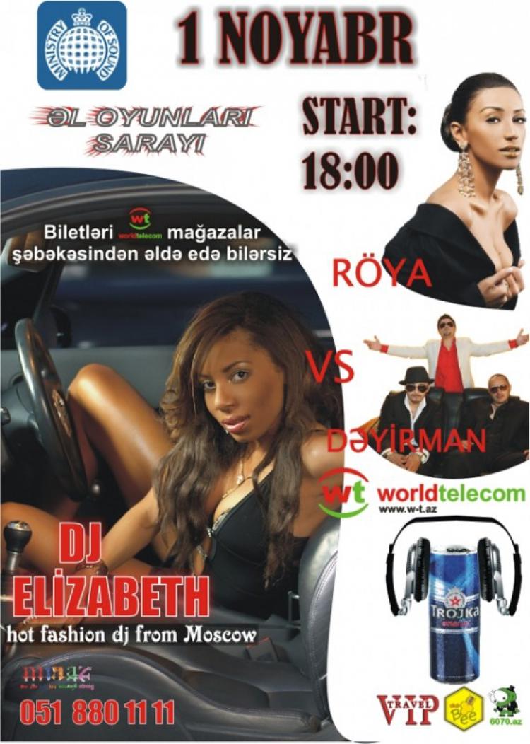 На концерте будут представлены последние песни Ройи, новый альбом Дейирман. А также самая главная новость - лучшая женщина-диджей России Dj Elizabeth у нас в Баку! Супер-свет и спецэффекты.