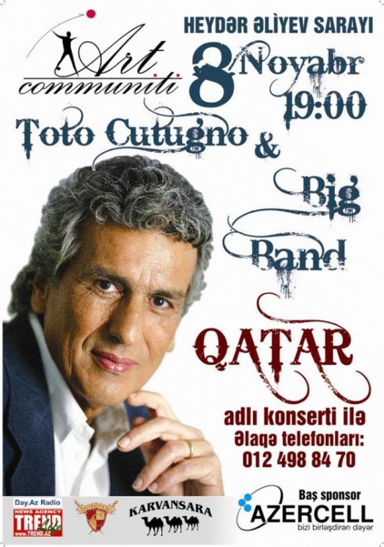 8 ноября в главном концертном зале страны, а именно во Дворце имени Гейдара Алиева, пройдет концерт популярного итальянского певца Тото Кутунио. Организатором концерта Тото Кутуньо под названием "Вагон" яваляется компания "ART COMMUNITY"