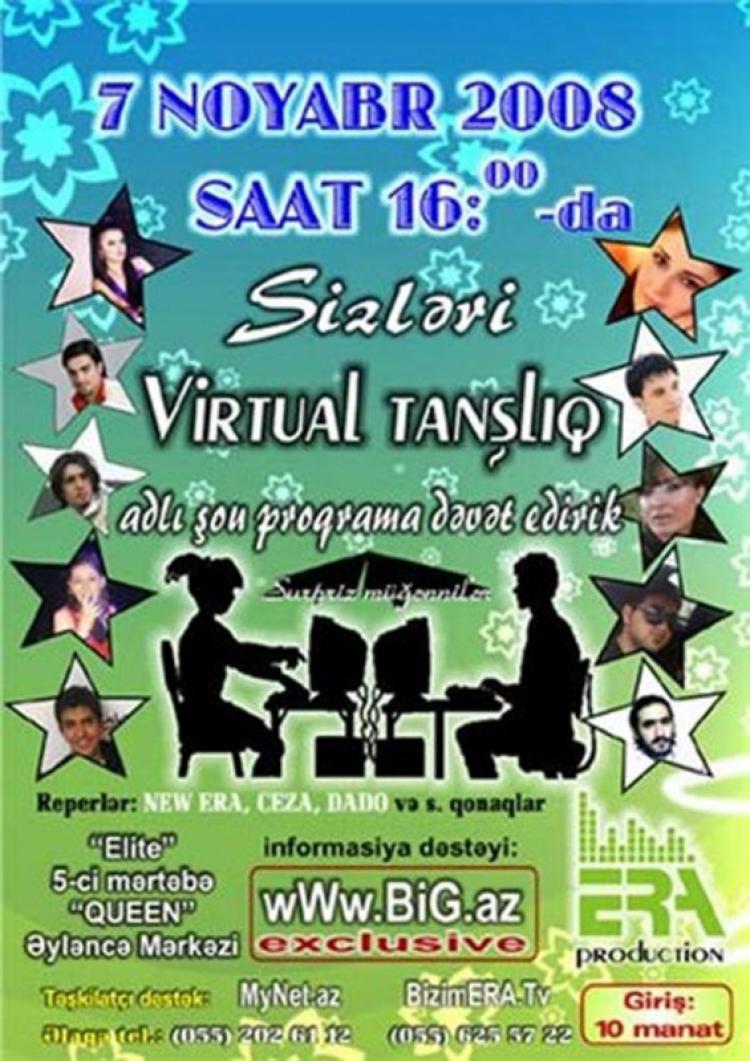 К сведению любителей виртуальных знакомств и интернет общения, 7 ноября, в 16:00 по местному времени в развлекательном центре "QUEEN", который расположен на 5-ом этаже "ELITE", состоится шоу программа под названием "Виртуальное Знакомство".