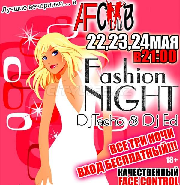 Три майских вечера подряд вечеринка Fashion Night в Af Club!! Только для вас лучшая зажигательная музыка от Dj Tacho и Dj Ed! Море удовольствия и яркого света! Если вы любите все это-тогда эта элитарная вечеринка для Вас!