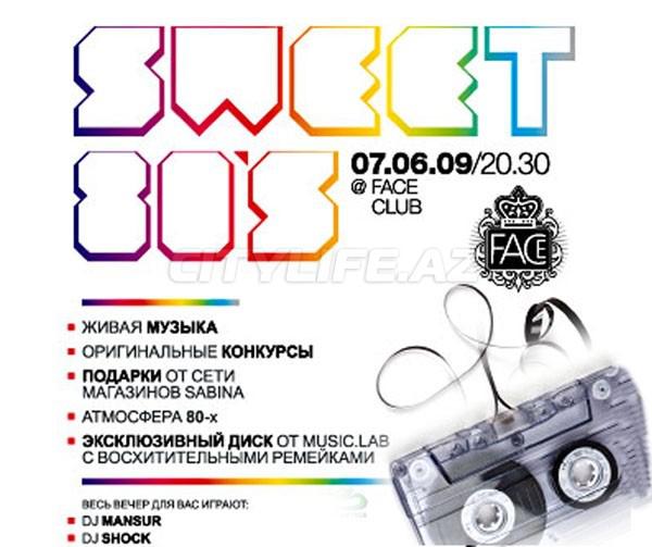 В клубе Face пройдет невероятная вечеринка в стиле диско 80-х "Sweet 80-th Party". Окунуться в атмосферу 80-х в этот вечeр Вам помогут Dj Shock и Dj Mansur, а также живая музыка,оригинальные конкурсы,подарки от сети магазинов Sabina и декорации в стиле классического диско 80-х. Дресс-код в стиле 80-х приветствуется и поощряется призом за самый оригинальный костюм. Все пришедшие в этот вечер в клуб Face, получат в подарок от MusicLab и Dj Shock, диск с потрясающим римейками на хиты прошлых лет.