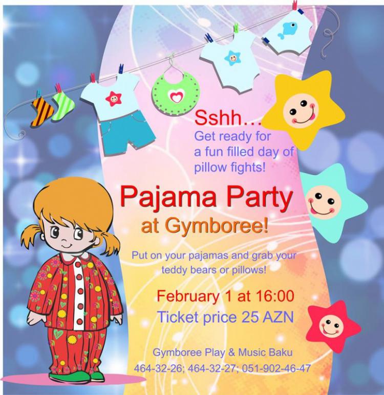 1 февраля Gymboree устраивает Праздник в Пижамах! Детишек ждёт катание на облаках, прыжки в спальных мешках, и, конечно же, бой подушками и ещё много всего интересного! Кстати, не забудьте одеть пижаму и захватить с собой подушку. Праздник пройдёт 1-го февраля в 16:00. Цена билетов 25 азн.