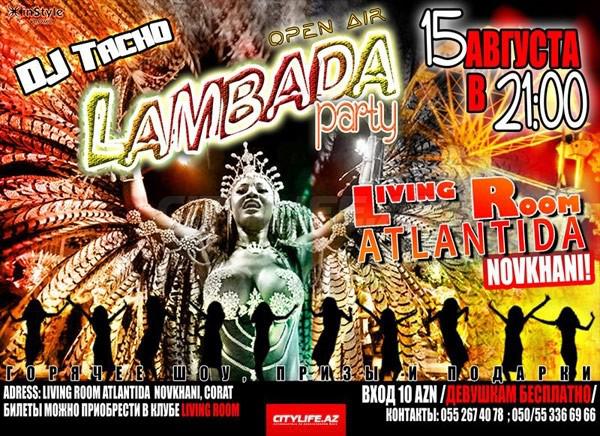 Всем любителям знойных, латиноамериканских вечеринок! Вас ждет Open Air Lambada Party в Living Room Atlantida Novhani! Горячее шоу, призы, подарки, а также музыка от DJ Tacho! Билеты можно приобрести в Living Room. Вход: 10 AZN, девушкам бесплатно. Телефоны: (+994 50/55) 336 69 66.