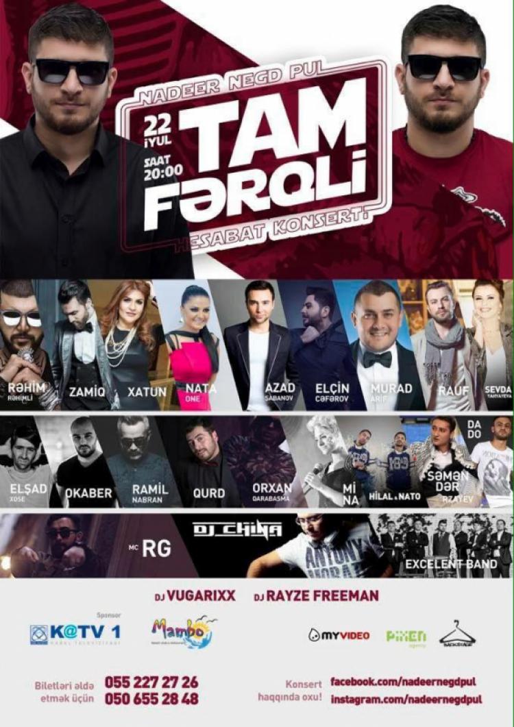 22 июля в Mambo Beach состоится мега вечеринка под названием Tam Fərqli, в котором примут участие местные звёзды: Рагим Рагимли, Замик, Натаван, Эльшад Хосе, Мурад Ариф, Азад Шабанов, Дадо, Dj China и многие другие. Контактный номер: +994 55 227 27 26, +994 55 655 28 48