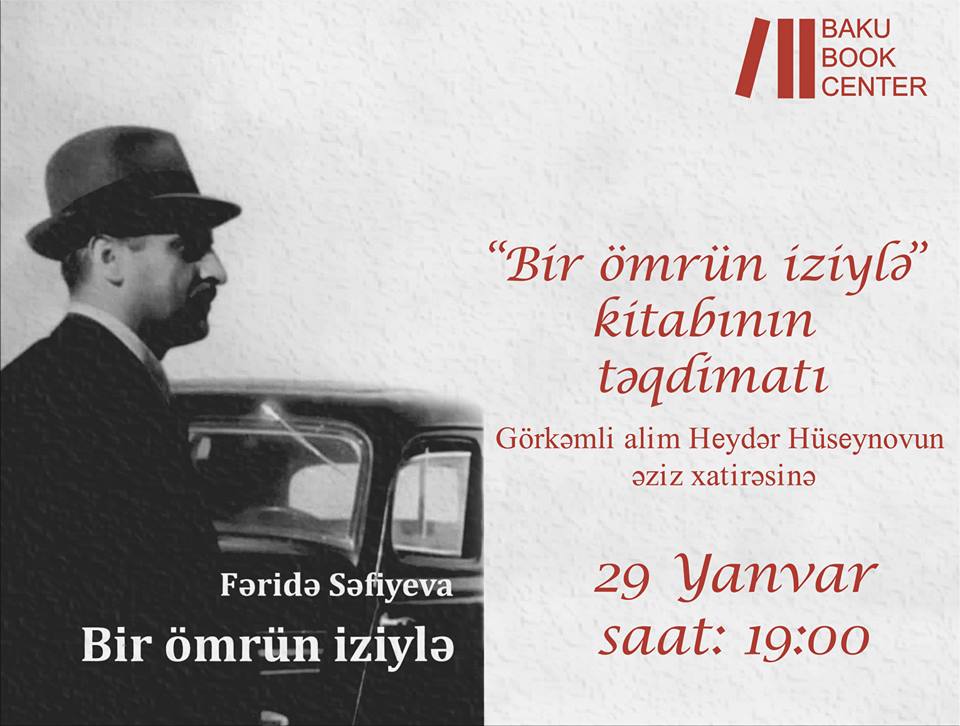 Əziz dostlar! Sizi yanvarın 29-da saat 19:00-da Bakı Kitab Mərkəzinə «Tarixlə üz üzə» layihəsinin çərçivəsində filologiya üzrə elmlər doktoru Fəridə Səfiyevanın “Bir ömrün iziylə” kitabının təqdimatına dəvət edirik. Kitab görkəmli Azərbaycan alimi, Azərbaycan SSR Elmlər Akademiyasının vitse-prezidenti, akademik Heydər Hüseynovun faciəvi həyat və zəngin yaradıcılığına həsr olunub.