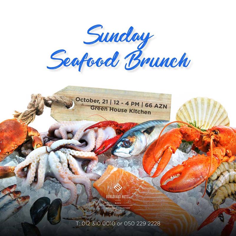 Специально для любителей рыбных деликатесов и суши. Мы ждем вас на традиционный бранч с 12:00 до 16:00, 21/10/2018. Вам непременно понравится многообразие морепродуктов, представленное в Green House Kitchen. Воскресный бранч — отличный повод собраться всей семьей и пригласить друзей! Цена на человека - 66 АЗН, дети с 6 до 16 лет - 33 АЗН, дети до 6 лет - бесплатно.