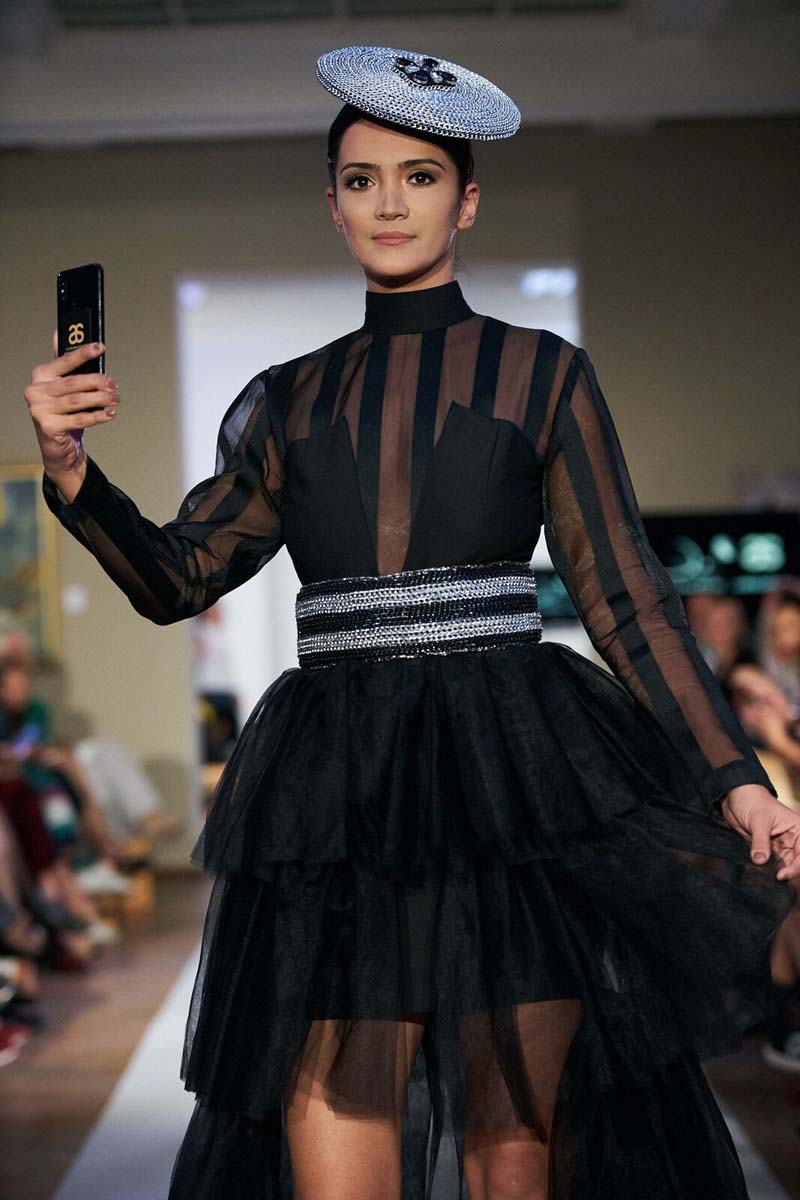 Следующий показ стал результатом коллаборации сразу двух брендов – Elian Couture и S.Abdul collection, и сочетал в себе дерзость и богемный шик. Модели в откровенных нарядах вышагивали по подиуму, делая селфи и выходя в эфир собственных инстаграм-аккаунтов. Интересным образом была обыграна полицейская форма, в особенности головные уборы и погоны, украшенные кристаллами и металлическими цепями.