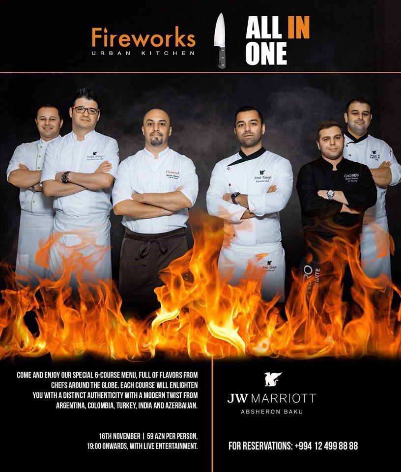 Ресторан Fireworks Urban Kitchen в отеле JW Marriott Absheron Baku приглашает вас 16 Ноября в 19:00 на очередной зажигательный вечер с ужином, где специальное фьюжн-меню из 6 блюд подготовили шеф-повара из разных стран: Аргентины, Колумбии, Индии, Турции и Азербайджана.