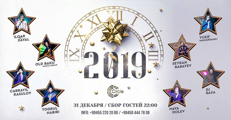 Встречаем Новый 2019-й вместе с рестораном «Circle»! Шумной компанией, только вдвоём или всей семьёй! Мы подготовили для вас сказочно крутую новогоднюю шоу-программу: Ильгар Хаял, Тогрул Хабиби, Хава Долев, Джабраил Расулов, Юсиф Магеррамли, танцевальная группа «Old Baku». Ведущий вечера Сейран Бабаев. Музыкальное настроение DJ Baxa. В новогоднем меню: наши бестселлеры — салаты и закуски, горячие блюда (рыба, мясо, курица), напитки на любой вкус.