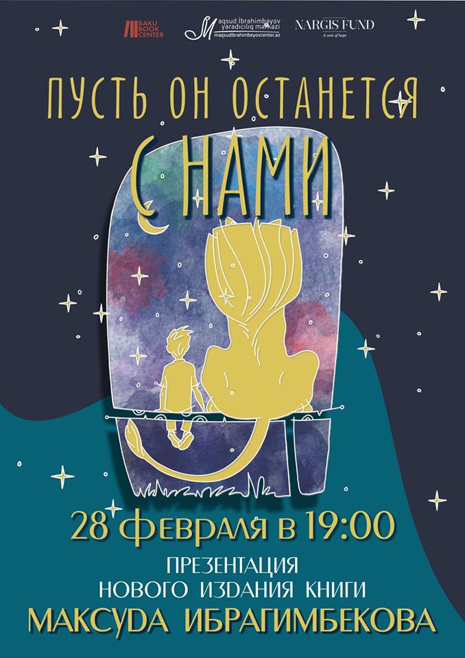 28 февраля в 19:00 состоится презентация переизданного на азербайджанском, английском и русском языках сборника народного писателя М. Ибрагимбекова «Пусть он останется с нами». В рамках мероприятия будут представлены иллюстрации художника Орхана Гараева, показан сценический этюд в исполнении студентов Университета Культуры и Искусств, ожидаются также интересные выступления. Приходите, будет интересно!