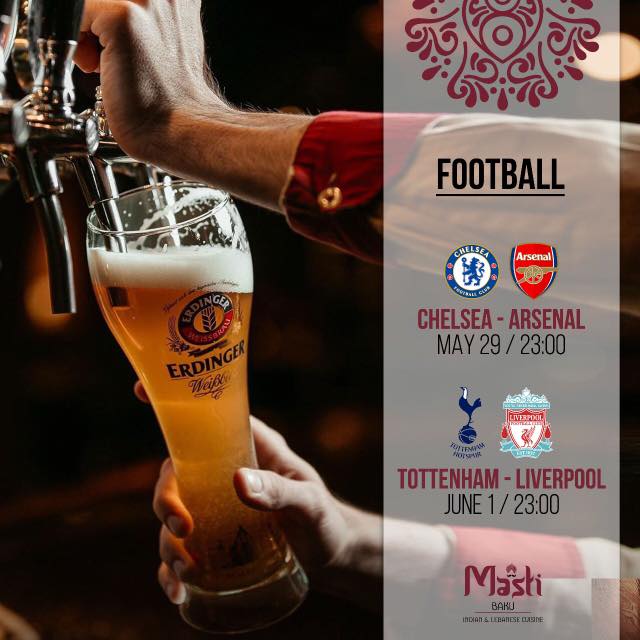 29 мая в Баку за трофей Лиги Европы УЕФА поспорят "Челси" и "Арсенал". 1-го же июня «Ливерпуль» и «Тоттенхэм Хотспур» встретятся на стадионе «Ванда Метрополитано» в Мадриде. Давайте посмотрим эти зрелищные матчи вместе в комфортной атмосфере MASTI BAKU!