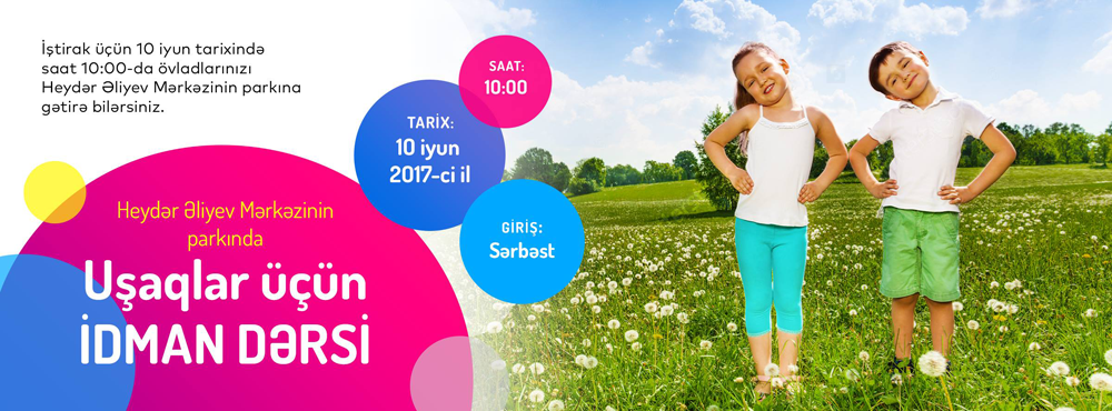 10 июня также пройдут спортивные занятия для детей в парке Центра Гейдара Алиева. Время: 10:00. Мастер-класс проведет 5-ти кратная чемпионка Республики, вице-чемпионка Европы по художественной гимнастике, тренер по лечебной физкультуре Аэлита Халафова. Обладать сильным и здоровым телом возможно благодаря спорту. Именно по этой причине ждем вас на открытых занятиях, организованных с целью повышения интереса у детей к спорту.