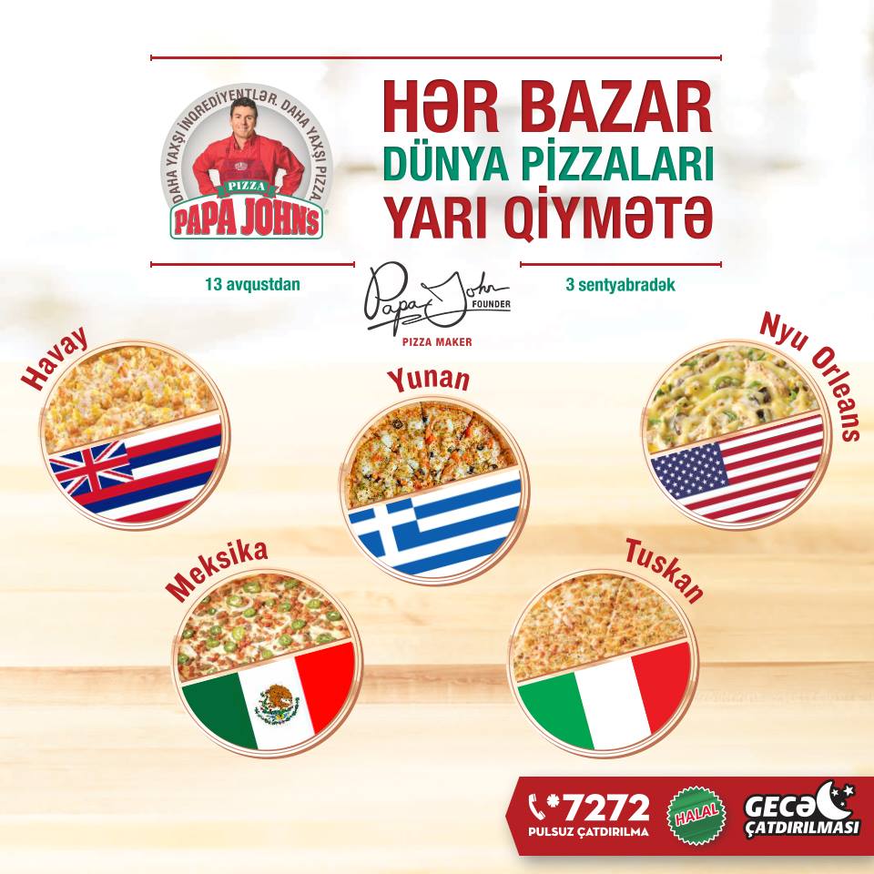 Окунитесь в атмосферу яркого путешествия с пиццами-мира от Papa John’s. Каждое воскресенье пиццы Гавайская, Греческая, Мексиканская, Тускан и Нью Орлеанс за пол цены! Акция активна с 13 августа по 3 сентября. Акция не распространяется мини пиццу.