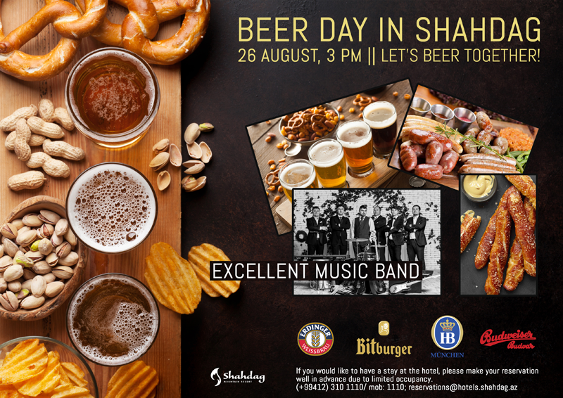 “День пива” пройдет на Горном курорте Shahdag 26 августа 2017 в 15:00. На мероприятии будут представлены такие бренды пива, как "Erdinger light”, “Erdinger dark”, “HOFBRAU light", «Budweiser», «Bitburger». Mick Rafiyev & Excellent Music Band развлечет гостей живой музыкой. Различные игры и вкусные закуски будут ждать гостей. Вход свободный. Контакты: (+994 12) 310 11 10, мобильный- 1110. Электронная почта: info@shahdag.az