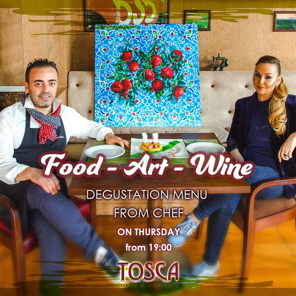 Ресторан "Tosca" приглашает вас на специальное мероприятие от шеф-повара Джованни Таволаро и одной из лучших художников Милены Набиевой. Шеф-повар подготвит для вас эксклюзивное меню с 5 блюдами, включая Рисовые Лепешки, Тыкву-Ризотто с Лягушками, Судак со сладким рисом Басмати и крем-брюле на десерт. Все будет сопровождаться экспозицией выставочного зала нашей художницы Милены Набиевой. Стоимость дегустации составит 45 AZN, включая только блюда.