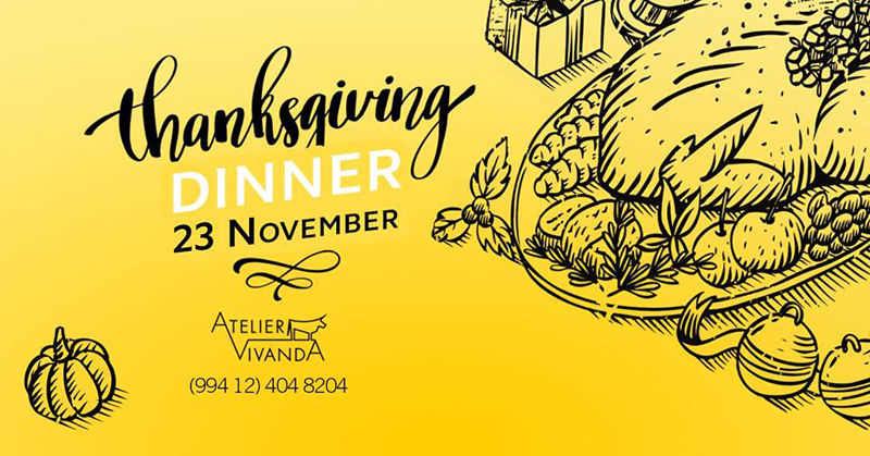 Сочный, вкусный, мясной – всё это об ужине в честь Дня благодарения в Atelier Vivanda! 23 ноября ждём всех фанатов мяса на вечер с живой музыкой и особым праздничным меню: нежная индюшка под пряным клюквенным соусом, овощной и картофельный гарниры, сочные салаты, ароматный яблочный пирог, и бутылка красного вина. Такое меню на четверых стоит – 228 AZN. Места ограничены, обязательно бронируйте столики заранее по телефону: (994 12) 404 82 04