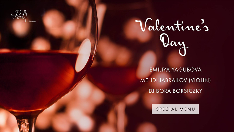 Приглашаем вас 14 февраля на праздничный и крайне романтичный ужин в Port Wine & Grill. В этот вечер для вас прозвучат все песни о любви в исполнении очаровательной Эмилии Ягубовой и талантливого скрипача Мехти Джабраилова. Ну а после бутылочки-другой хорошего вина ноги сами потянут вас на танцпол в Vinoteka - Port Wine & Grill, где диджей Bora Borsiczky сыграет особенный сет. Шеф-повар Александр приготовил для вас специальное предложение: