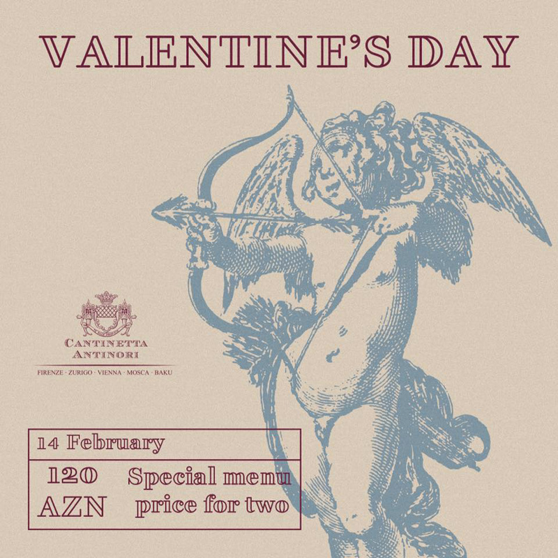 Cantinetta Antinori приглашает всех влюбленных на незабываемый романтический вечер! Проведите этот день со своей второй половинкой, наслаждаясь бокалом итальянского вина! Мы приготовили для вас специальное меню на двоих стоимостью 120 азн. Бронируйте столик по номеру (+994 12) 497 56 46
