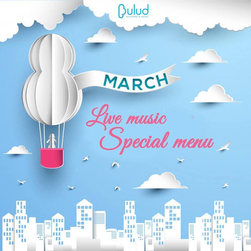 Милые женщины, девушки, девочки! Приближается самый красивый день в году - 8 марта, и мы приглашаем вас отметить этот чудесный день с нами в Bulud lounge. Весь вечер с вами живая музыка в исполнении Ролана Сеидова и 2 вида специального праздничного меню, стоимостью 85 азн на 2 персоны. Мы ждём вас, резервируйте столики уже сейчас!