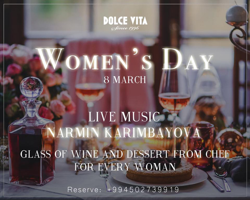 Дорогие женщины, наконец мы дождались самого нежного и доброго праздника! Ресторан "Dolce Vita" обещает сделать этот день незабываемым! Традиционная итальянская кухня, лучшие сорта вин и живая музыка ждут вас! Специальный гость вечера Нармин Керимбекова порадует вас своим мелодичным вокалом. Наш шеф также приготовил специальный десерт для каждой гостьи. И "Astoria Prosecco", внося свою лепту в этот незабываемый день угостит каждую представительницу прекрасного пола бокалом вкусного вина! Не упустите этот особенный вечер и скрасьте его своим присутствием!