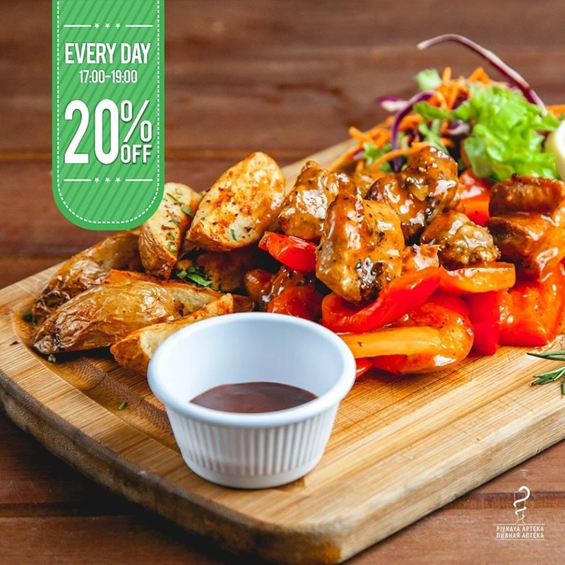 Pivnaya Apteka приглашает: наблюдайте за нашими счастливыми часами каждый день с 17:00 до 19:00, когда на все меню скидка - 20%!
