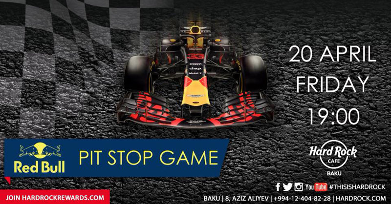 Близятся гонки F1 и весь город окутан приятным предвкушением самого настоящего праздника! Мы также решили не отставать! Поэтому приглашаем вас проверить себя на скорость и присоединиться к увлекательной игре, организованной командой Red Bull и Hard Rock Cafe Baku! Для этого у нас есть все необходимое: стенд с настоящим болидом, настоящие шины и другое оборудование. Количество участников - 60 человек, то есть 30 команд, а это значит, что в каждой команде будет 2 участника. Каждый участник сможет почувствовать себя членом команды легендарных гонок Формулы 1, ведь придётся за считаные секунды менять шины. Осталось только собрать команду и зарегестрироваться для участия. За более подробной информацией об условиях участия обращайтесь по нашим контактным номерам. Готовы? Тогда поехали!